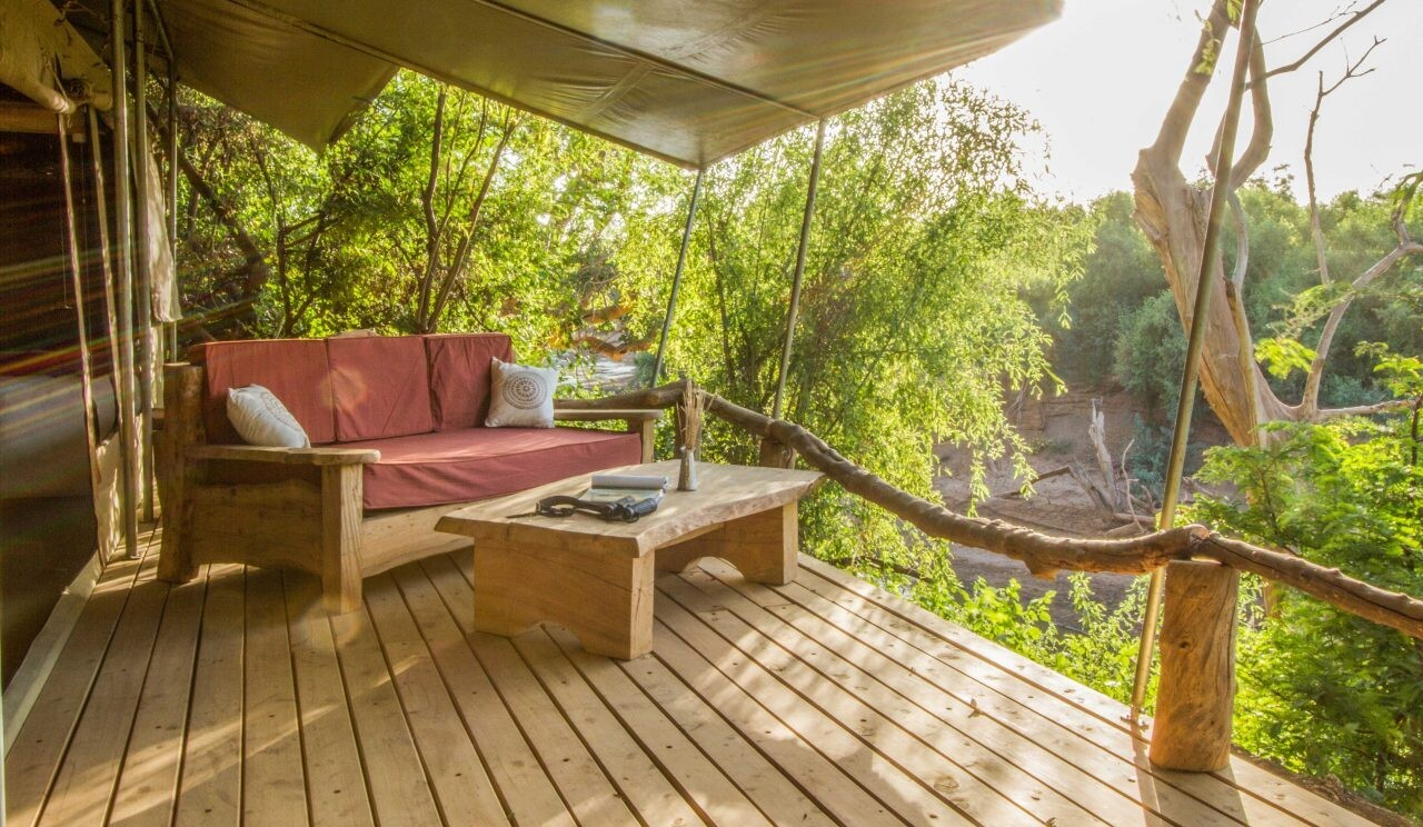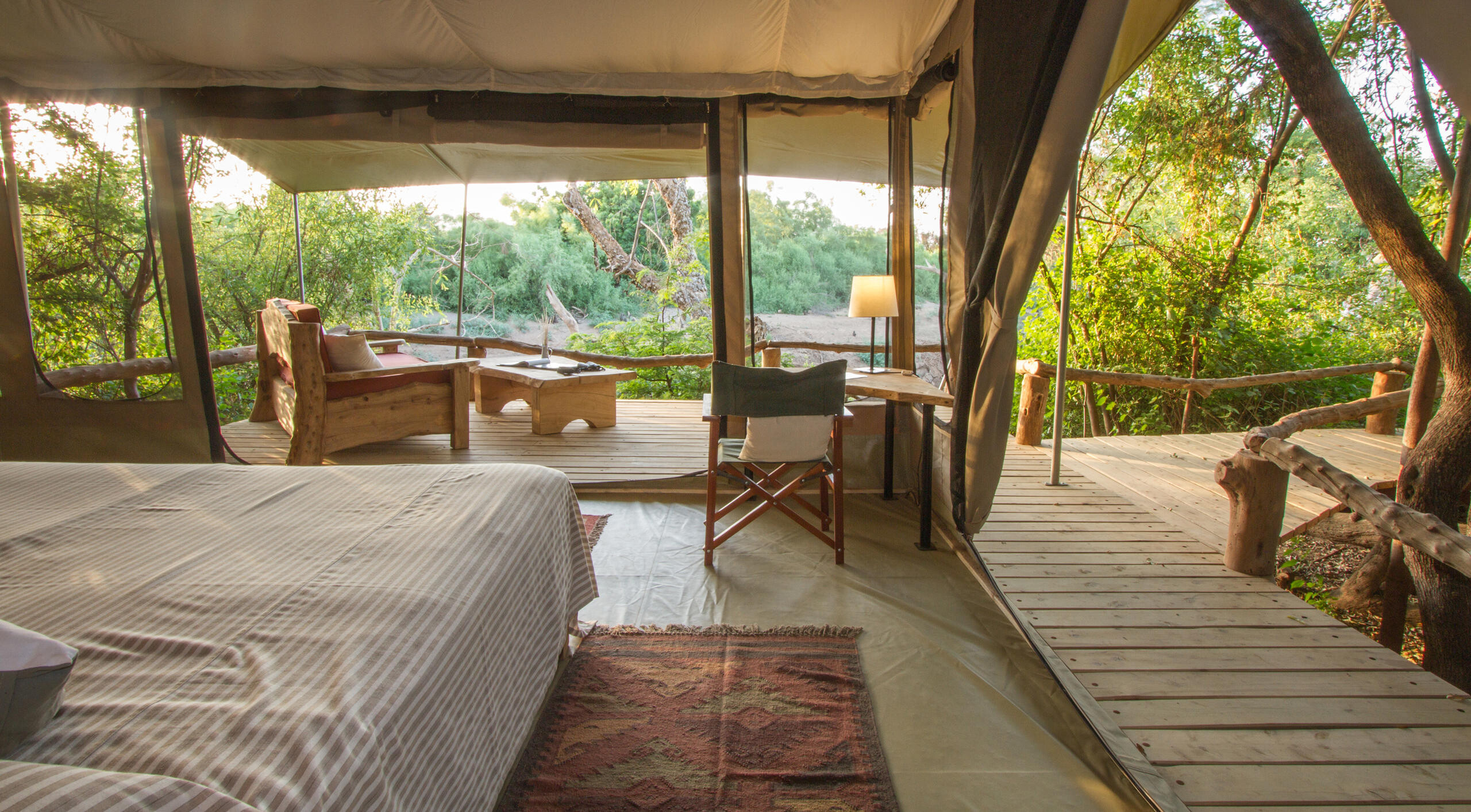 Private, spacious, and rustic All six tents are set within the thick cordia bushes; two with river view, two looking out over the plains and two with a treehouse feel.They are all hidden from each other and totally private with large verandas. They have large netted windows all the way round to allow a good air flow through the tent. The bathrooms are all en-suite with flush loos and hot and cold running water for showers.